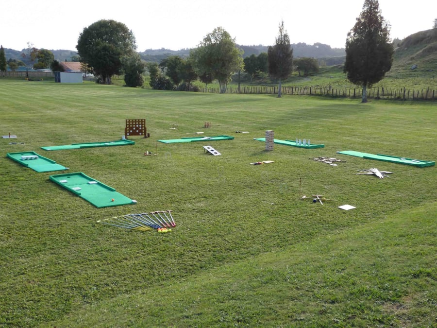 Each hole is made up of 3 x interconnecting grass mats. Each mat is 75cm wide x 1metre long, meaning that when connected, the 3 mats make a hole that is 75cm wide and 3 metres long. This particular course is 6 holes. The course includes matching bumpers that go around the outside to keep the ball in play.